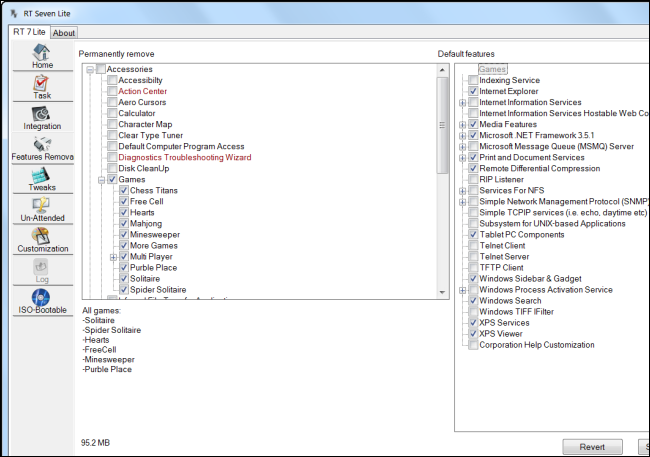 • On the Features Removal or Components tab, you can permanently remove components from your Windows installation disc and control which Windows features are installed by default. For example, you can remove the included games from your Windows installer disc, or force Windows to install the IIS web server by default.