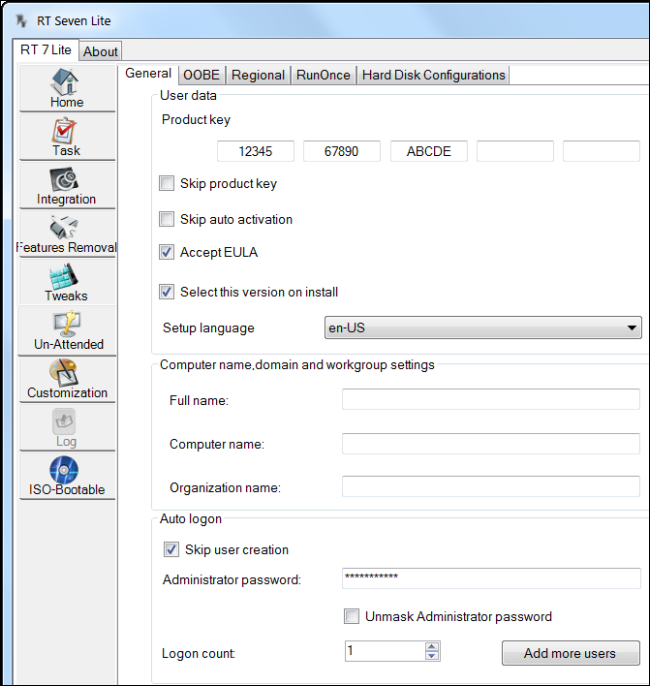 • For example, you can enter your product key ahead of time so Windows won’t ask you for it. The other tabs allow you to control other settings – for example, selecting the hard disks that Windows will install on. If you complete enough of these settings, Windows will install automatically without asking you any questions during the installation, allowing you to perform an unattended Windows installation.