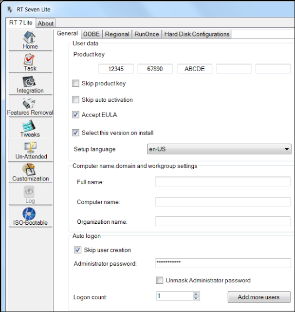 • The Unattended section allows you to create an unattended installation disc – you provide answers to installation questions beforehand and Windows will install without asking you these questions during the installation process.